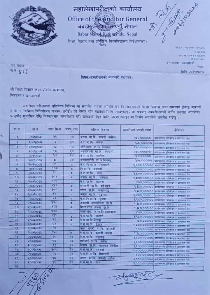 अब कुरा कोल्हवी नगर मित्र भएका विद्यालयहरुमा भएका बेरुजु रकम बारे!काठमाडौं मा रहेको महालेखा परीक्षको कार्यालय ले २०७९/०३/१३ गते निकाले को सम्परीक्षण प्रतिवेदन मा बारा को कोल्हवी नगरपालिका भित्रका विद्यालय हरुको बाकि रहेको बेरुजु को रिपोर्ट । परीक्षक कार्यालयले यी विद्यालय हरुलाई कार्यसम्पादन प्रतिवेदन र कार्य गरेको कागजात पेश गर्न माग गरेको छ ।