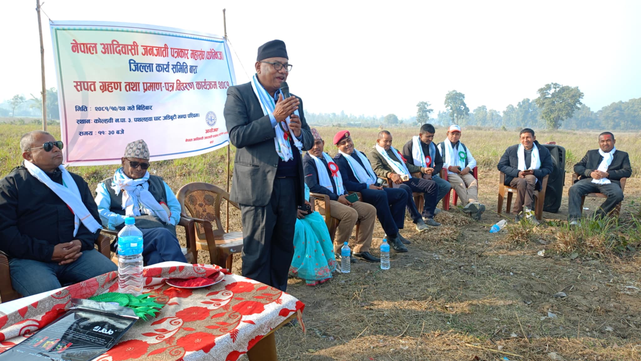 कोल्हवी:नेपाल आदिवासी जनजाति पत्रकार महासंघ (फोनिज) बाराका निर्वाचन कमिटीका सह संयोजक भुवन चौधरी थारूको अध्यक्षतामा तथा कोल्हवी नगरपालिकाका नगर प्रमुख राम प्रसाद चौधरीको प्रमुख आतिथ्यतामा नव निर्वाचित पदाधिकारी तथा सदस्यहरुको सपथ ग्रहण तथा प्रमाणपत्र बितरण कार्यक्रम आज सम्पन्न भएको छ।