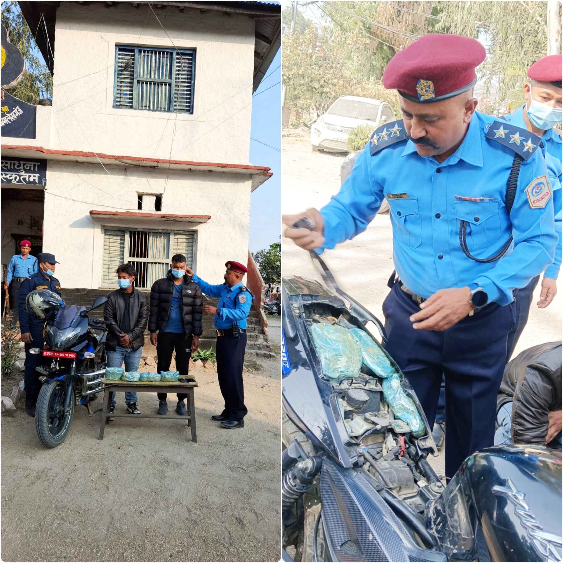 प्रहरिले बा.प्रदेश ०३-००३ प ३१२६ नम्बरको २२० सि.सि.को पल्सर मोटरसाईकललाई रोकी चेक जाँच गर्दा सिटमुनी लुकाई छिपाई लगी रहेको निम्न बमोजिम लागू औषध अफिम जस्तो पदार्थ वरामद गरी मानिस समेत नियन्त्रणमा लिई आवश्यक कानूनी प्रकृया अगाडी बढाईएको प्रहरिले जनाएको छ।