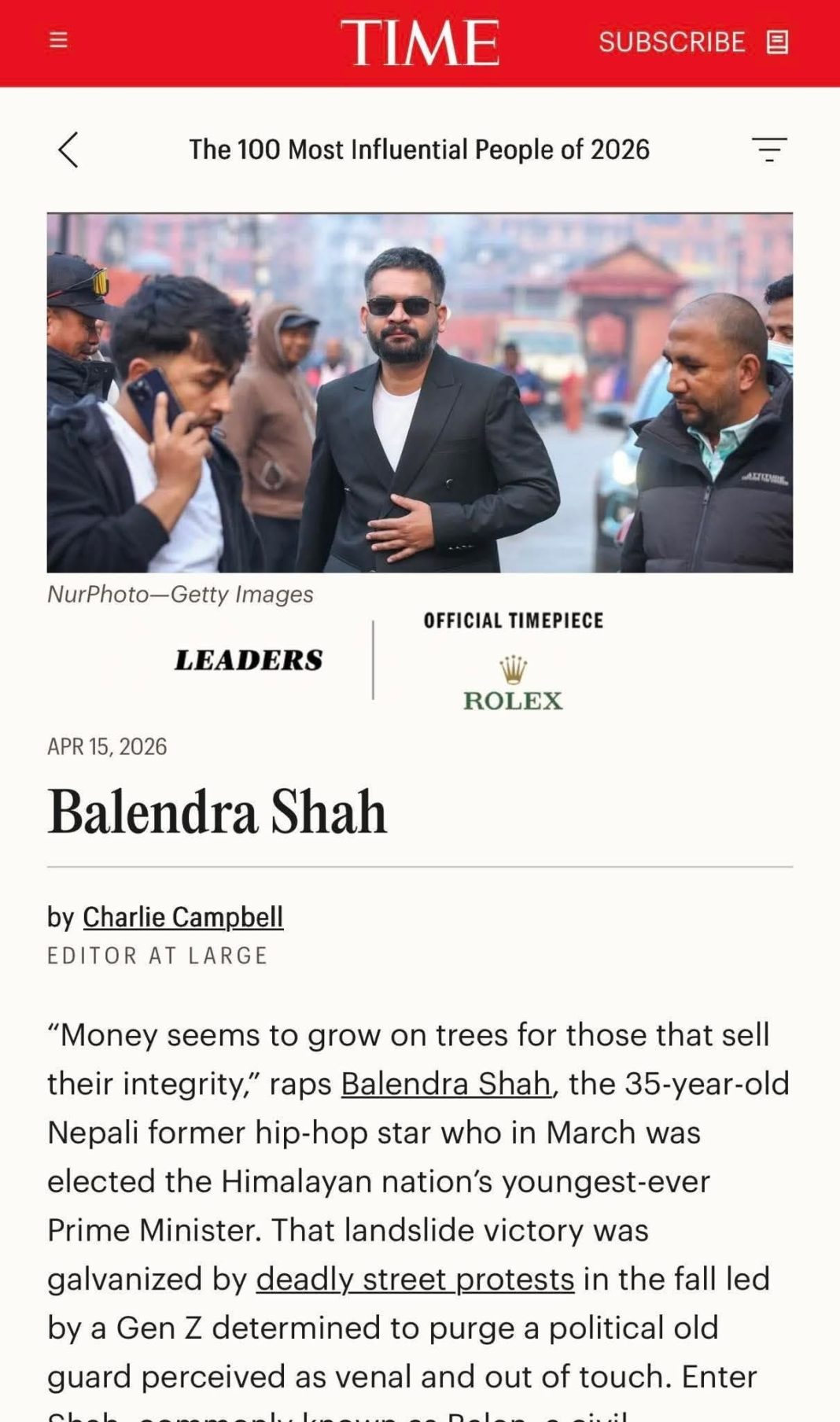 नेपालका प्रधानमन्त्री बालेन्द्र शाह (बालेन) अन्तर्राष्ट्रिय मञ्चमा थप चर्चामा आएका छन्। प्रतिष्ठित Time Magazine ले सार्वजनिक गरेको सन् २०२६ का विश्वका १०० प्रभावशाली व्यक्तिहरूको सूचीमा उनको नाम समावेश भएको हो।